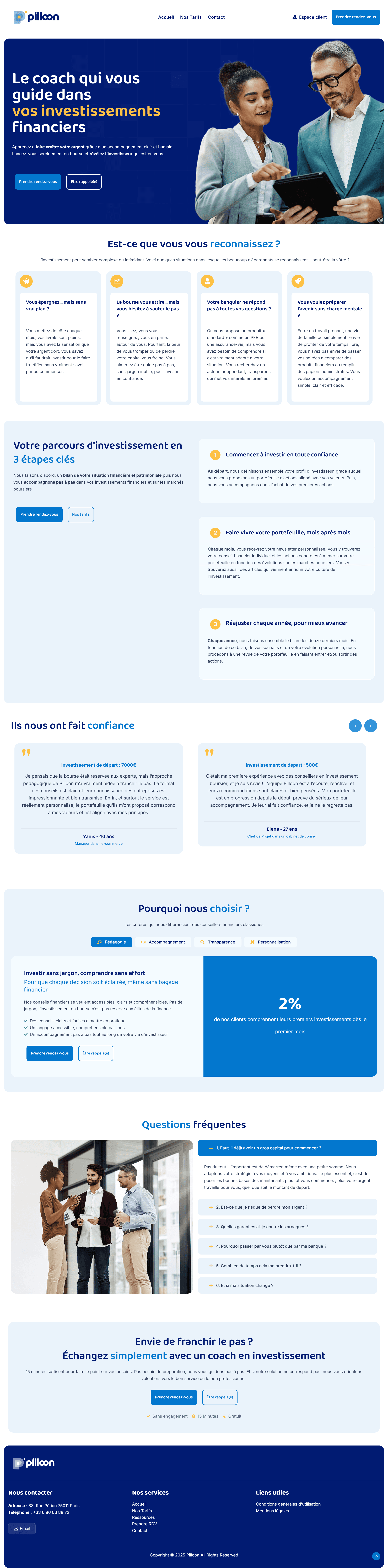 Pilloon souhaitait se lancer sur le marché du coaching en investissement boursier avec une proposition de valeur unique : rendre l'investissement accessible à tous, même aux débutants avec de petits budgets.